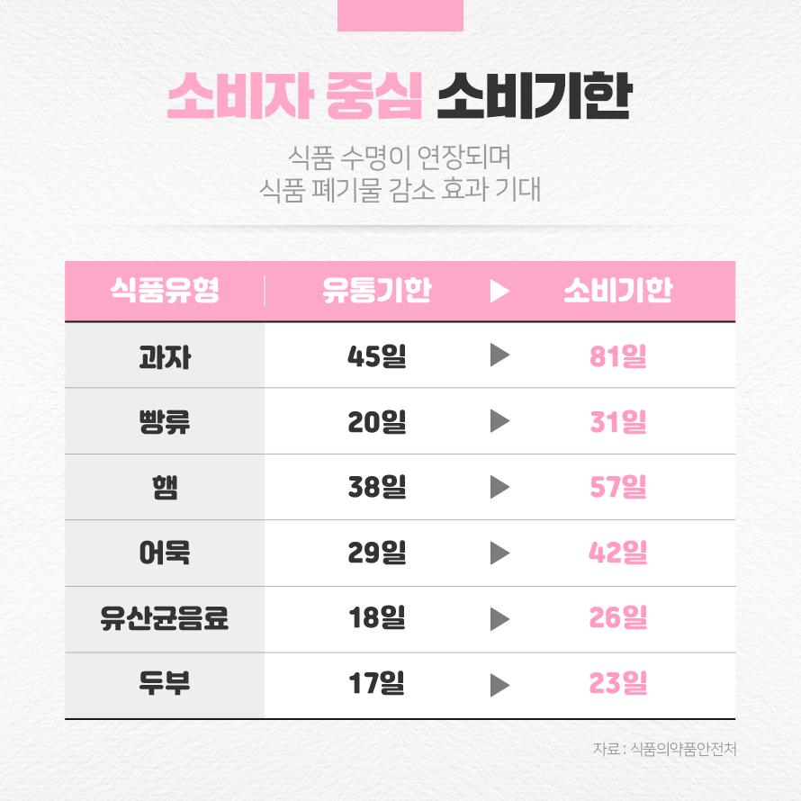 소비기한은 소비자에게 정확한 정보를 제공하고, 식량 낭비를 줄이기 위한 목적으로 도입되었습니다. 유통기한은 제조일로부터 식품을 유통, 판매할 수 있는 기한입니다. 즉 유통기한이 지나도 일정 기간 섭취가 가능합니다. 예를 들어 과자는 소비기한이 81일로 유통기한보다 36일 길고, 두부의 소비기한은 23일로 유통기한보다 6일 더 깁니다. 그럼에도 불구하고 많은 소비자들이 유통기한을 폐기해야 하는 시점으로 인식해 왔습니다.
