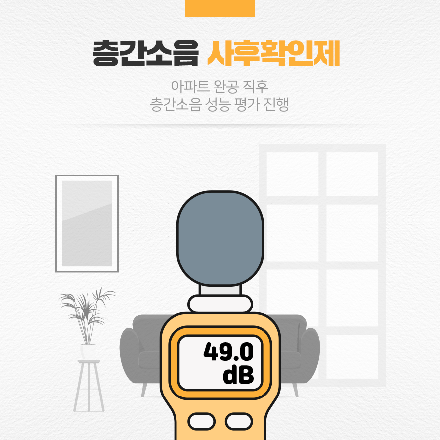 층간소음 문제가 심화되며 정부에서는 ‘층간소음 사후확인제도’를 도입했습니다. 아파트 완공 직후 층간소음 차단이 잘 되는지 확인하는 절차입니다. 만일 바닥 충격음 차단 성능 검사 결과가 기준에 미치지 못했다면, 사업자에게 보완 시공이나 손해배상 등을 권고할 수 있습니다.