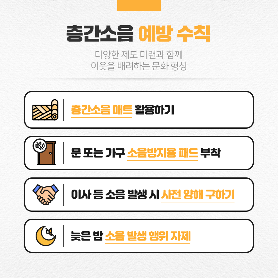 또한 문 또는 가구에 소음방지용 패드를 부착하거나 도어가드를 활용하면 미리 소음을 방지할 수 있습니다. 만일 인테리어 공사, 친척 모임, 이사 등으로 불가피하게 소음이 발생할 경우에는 사전에 인근 세대에 양해를 구하는 것이 좋습니다.