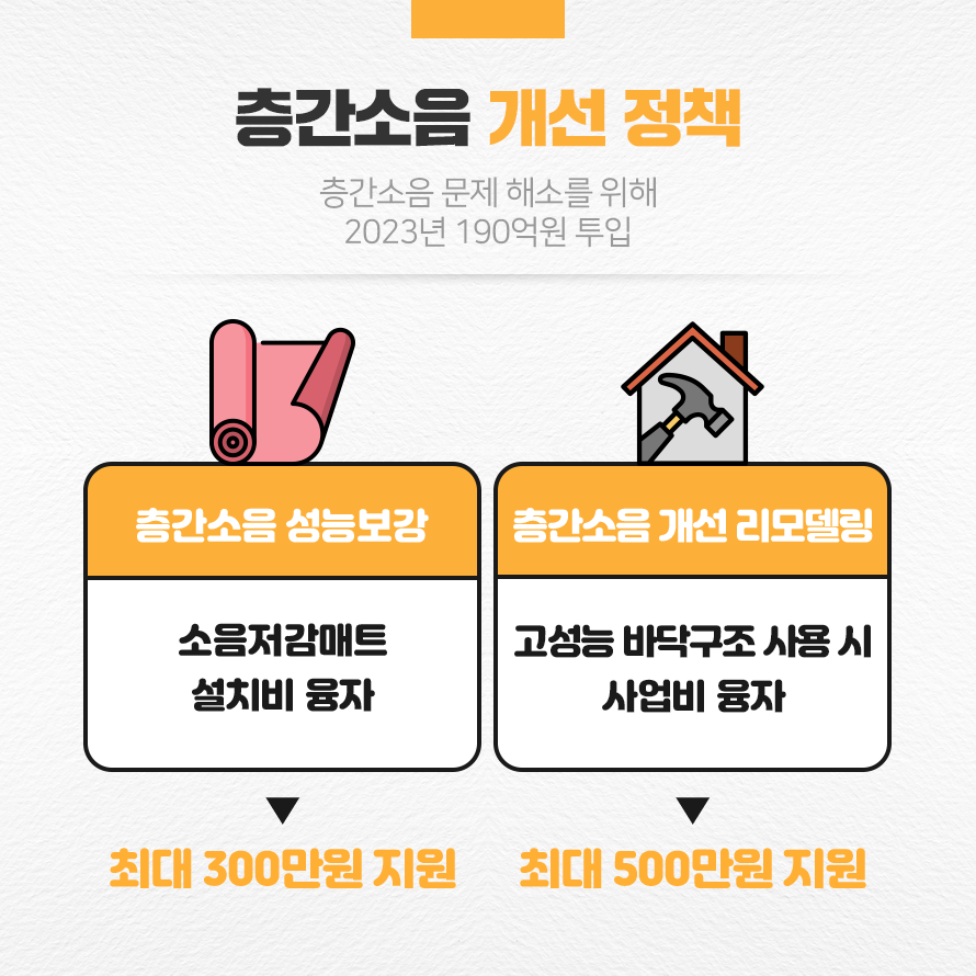 그리고 층간소음 개선 리모델링을 위해 40억원을 투입합니다. 1, 2등급 성능의 바닥구조를 사용하면 최대 500만원의 사업비를 연 4.0% 이자로 융자 지원해주는 사업입니다. 지원 대상은 85㎡ 이하 분양주택으로, 임대주택은 제외합니다.
