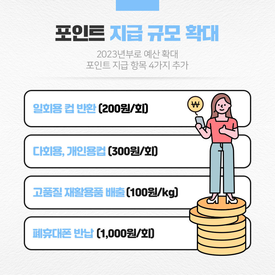 2023년부로 포인트 지급 규모와 항목이 확대됩니다. 2023년 탄소중립실천포인트 예산 규모는 89억원으로 2022년에 비해 64억 5천만 원이 늘었습니다. 환경부는 확대된 예산을 활용해 탄소중립 포인트 항목을 4가지 더 추가하였습니다.