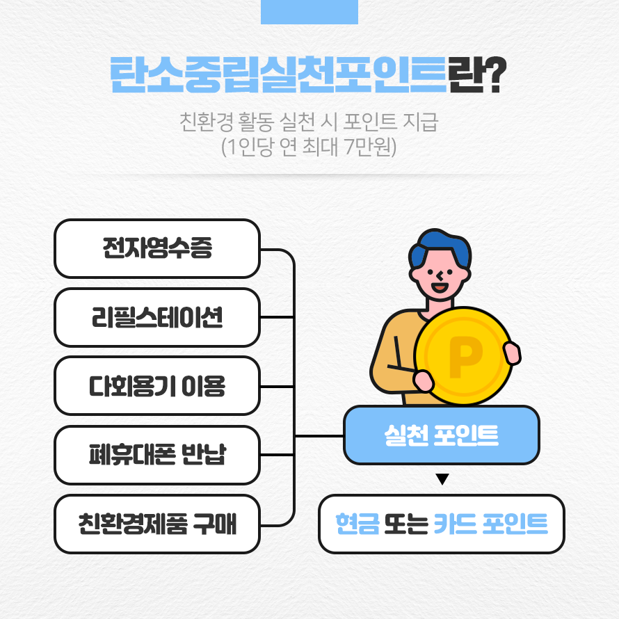 ‘탄소중립실천포인트’는 시민들이 일상생활에서 탄소중립을 실천하도록 장려하고자 만든 제도입니다. 전자영수증 발급, 리필스테이션 이용, 다회용기 이용, 폐휴대폰 반납 등 친환경 활동을 실천한 사람에게 정부가 포인트를 지급합니다. 최초 가입자의 탄소중립 생활 실천을 유도하기 위한 실천 지원금도 지급합니다. 실천 항목 10개 중 몇 개를 실천했느냐에 따라서 최대 5,000원을 지급합니다.