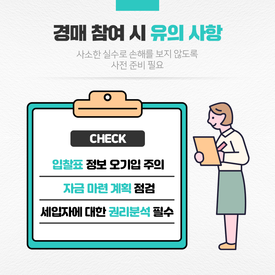 경매에 참여하고자 한다면 자금 마련 계획 또한 점검해야 합니다. 경매는 잔금 납부 기일을 연장할 수 없고 잔금을 내지 못하면 보증금만 날린 채 재경매가 시작되기 때문입니다. 따라서 은행 대출을 받아 잔금을 마련하고자 한다면 반드시 잔금 납부 기일 안에 대출이 실행되어야 한다는 점을 유념해야 합니다.