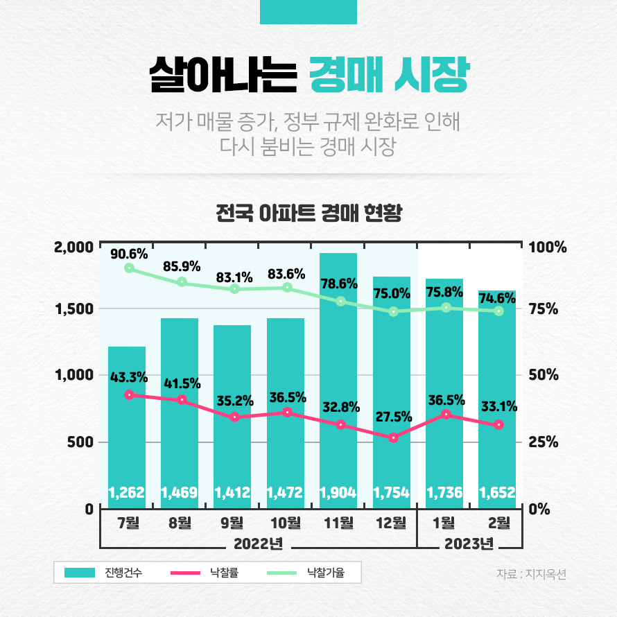 경매 시장이 되살아난 이유는 시세보다 저렴한 매물이 누적되었기 때문입니다. 심지어 감정가보다 낮은 가격에 입찰이 이루어지며 2023년 2월 전국아파트 낙찰가율은 74.6%로 최저치를 기록한 바 있습니다. 경매에서 유찰되면 최저 입찰가가 내려가는데 부동산 시장 침체기를 거치며 2~3차례 유찰이 일반화되었습니다. 이에 경매 시장에서는 감정금액 대비 30~40%씩 저렴한 매물이 늘며 투자 수요가 집중되고 있습니다.