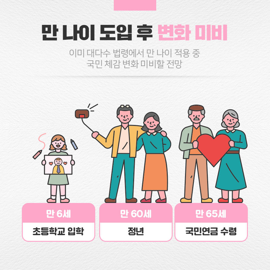 2023년 6월 28일부터 ‘만(滿) 나이 통일법’이 시행됩니다. 기존 3가지 나이 계산법이 함께 쓰이면서 벌어진 혼선을 막고 법적, 행정적 분쟁이 해소될 것으로 기대됩니다. 한편 만 나이 도입으로 초등학교 입학 시기, 정년, 보험료 산출 기준 등 달라지는 점이 없는지 궁금해하는 목소리가 나오고 있는데요. 오늘은 ‘만 나이 도입 후 달라지는 것’에 대해 알아보도록 하겠습니다.