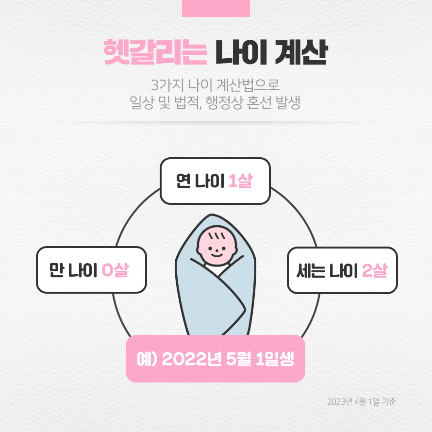우리나라에서 쓰이는 나이 계산법에는 만 나이, 세는 나이, 연 나이가 있습니다. 만 나이는 출생일을 기준으로 1년이 지났을 때 한 살이 되는 것으로 국제적으로 통용되는 나이 계산법입니다. 세는 나이는 가장 보편적인 나이 계산법으로 출생일부터 한 살로 치고 해가 바뀔 때마다 한 살씩 늘어나는 방식입니다. 연 나이는 행정 서비스의 효율성을 위해 법령에서 적용하는 개념으로 현재 연도에서 출생 연도를 빼서 계산하는 방식입니다.