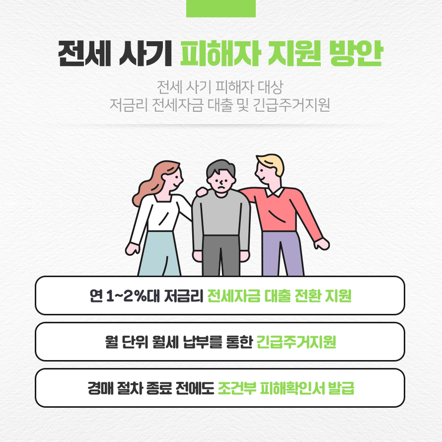 저리 전세자금 대출과 긴급주거지원을 받을 때 필요한 ‘전세 사기 피해확인서’는 신속 발급할 수 있게 했습니다. 경매 절차가 끝나기 전이더라도 보증금 피해가 확실하다면 조건부로 피해확인서를 발급받을 수 있습니다. 전세 사기 피해확인서 유효기간도 3개월에서 6개월로 늘렸습니다.