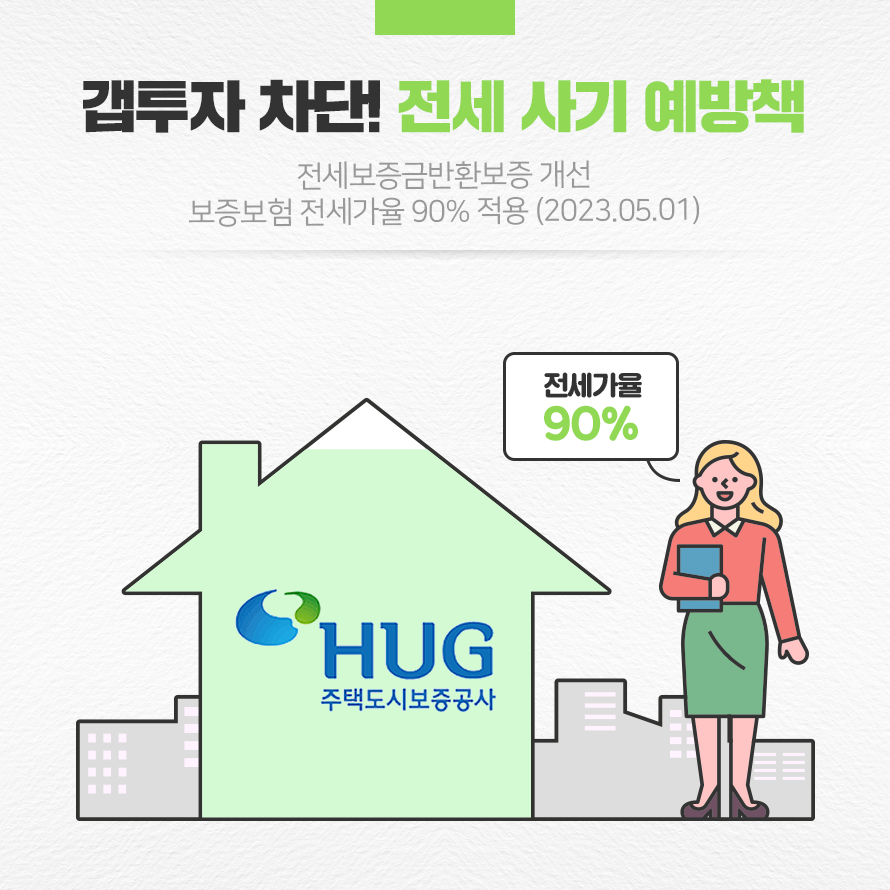 먼저 전세 사기의 가장 큰 원인인 무자본 갭투자를 근절하고자 전세보증금반환보증을 개선했습니다. 전세 사기 근절을 위해 2023년 5월 1일부터 기존 100%였던 전세보증금반환보증 가입 대상 주택의 전세가율 요건을 90%로 하향 조정합니다. 즉 전세 보증금이 주택 매매가의 90% 이하여야 전세보증금반환보증보험에 가입할 수 있습니다.