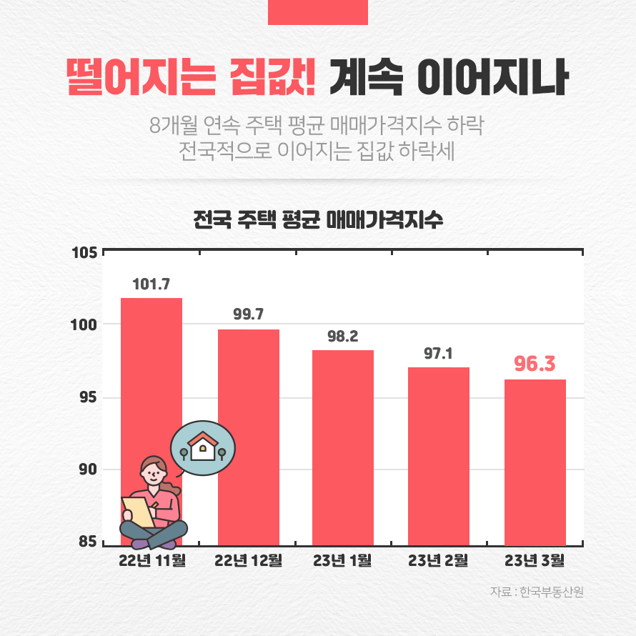 8개월 연속 전국적인 집값 하락세가 지속되고 있습니다. 한국부동산원에 따르면 2022년 7월부터 전국 주택 평균 매매가격지수가 지속 하락세를 유지하고 있습니다. 2023년 1월에는 98.2, 2월에는 97.1, 2023년 3월에는 96.3을 기록하며 올해에도 지속적인 하락세를 유지하고 있습니다. 서울(-0.55), 수도권(-0.89), 지방권(-0.69) 모두 동일하게 하락세를 보이고 있습니다.