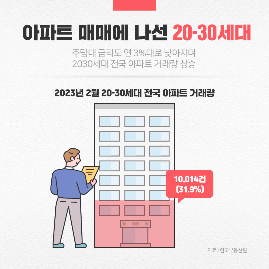 가파른 집값 하락 흐름을 타고 2030세대의 아파트 매입이 늘고 있습니다. 한국부동산원에 따르면 2023년 2월, 전국 아파트 거래량 31,337건 중 20-30세대의 거래량은 10,014건으로 전체 거래량의 약 31%를 차지했습니다. 이는 2021년 1월 이후 2년 1개월 만의 최고치입니다. 2022년 10월 26%까지 떨어졌던 서울 아파트 20-30세대 매입 비중 역시 34.7%로 증가했습니다.