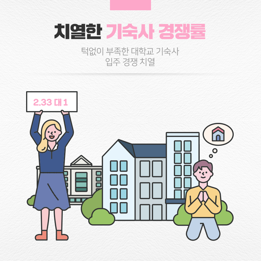 대학의 주요 정보를 알리는 웹사이트가 공개한 2022년 수도권 대학의 평균 기숙사 수용률은 18.3%로 현재 대학교 기숙사의 수용 인원이 신청 인원에 비해 턱없이 부족한 상황입니다.