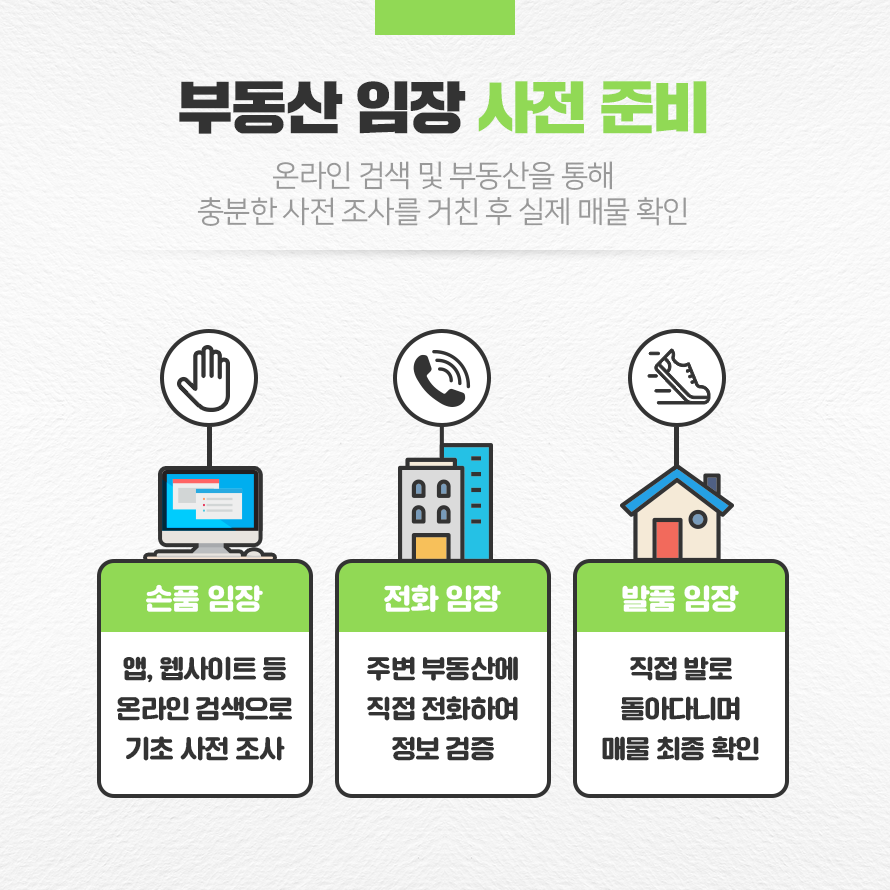 손품을 팔아 1차 조사를 마무리했다면 공인중개사에 직접 전화를 돌려 매물 정보를 확인하는 것이 좋습니다. 온라인에서 알아본 정보가 잘못된 것일 수도 있는 만큼 지역 부동산을 통해 잘못 알려진 정보는 없는지 미리미리 확인하고 추가적인 정보를 얻는 것이 좋습니다.