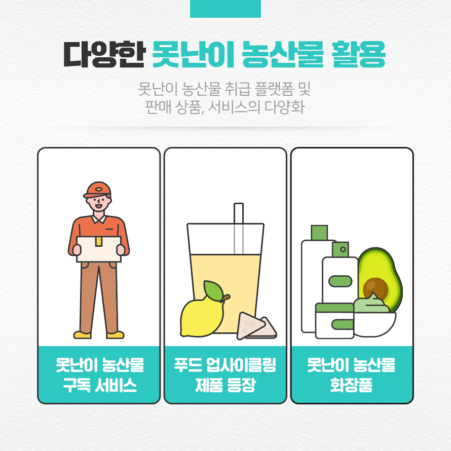지속가능성을 중시하는 ESG경영이 기업들의 새로운 화두로 떠오르면서 기업들이 못난이 농산물을 활용하는 사례도 증가하였습니다. 특히 버려지는 농산물을 가공한 푸드 업사이클링 제품이 속속 등장하고 있습니다. 한 제조업체는 즉석밥 제조 과정에서 나오는 조각난 쌀을 활용하여 만든 과자를 선보였으며, 또 다른 식품업체는 못난이 농산물을 가공해 주스, 선식을 선보이기도 했습니다. 아울러 2023년 1월, 농림축산식품부는 ‘농식품 부산물을 활용한 식품 새 활용(업사이클링)’을 10대 푸드테크로 선정하여 기업의 연구 개발 사업을 적극 지원하기로 했습니다.