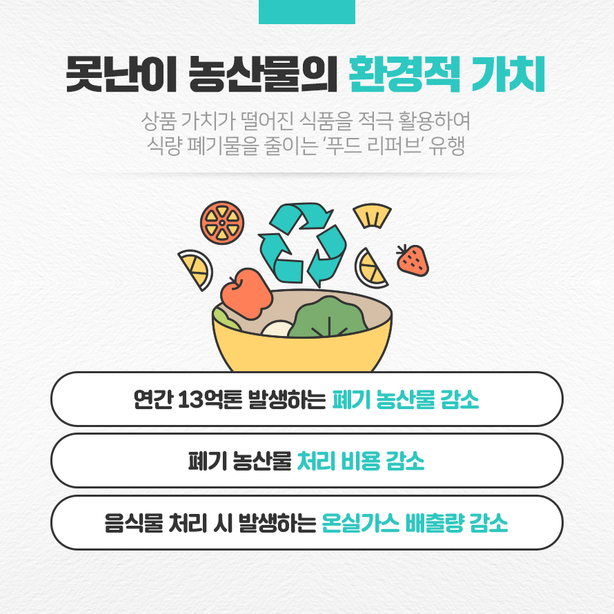국내에서도 등급 외 판정을 받아 산지에서 폐기되는 못난이 농산물 처리에만 연간 6,000억원의 비용이 발생하고 있어, 환경 보호에 대한 관심과 함께 못난이 농산물의 환경적 가치가 주목받고 있습니다.