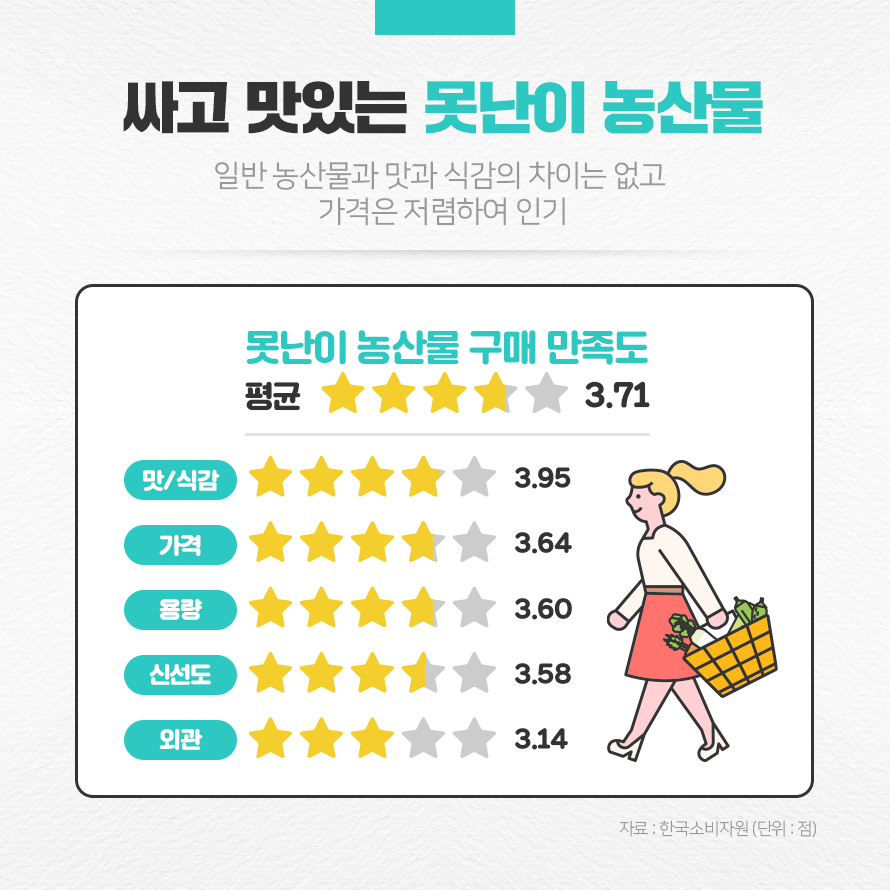 생김새만 조금 다를 뿐 일반 농산물과 맛에서는 크게 차이가 없어 소비자들의 만족도도 5점 만점에 평균 3.71점으로 높습니다. 맛과 식감에 대한 만족도가 가격에 대한 만족도보다 높게 나타났으며, 10명 중 9명이 못난이 농산물을 재구매할 의사가 있다고 말할 정도로 못난이 농산물에 대한 만족감을 드러냈습니다.