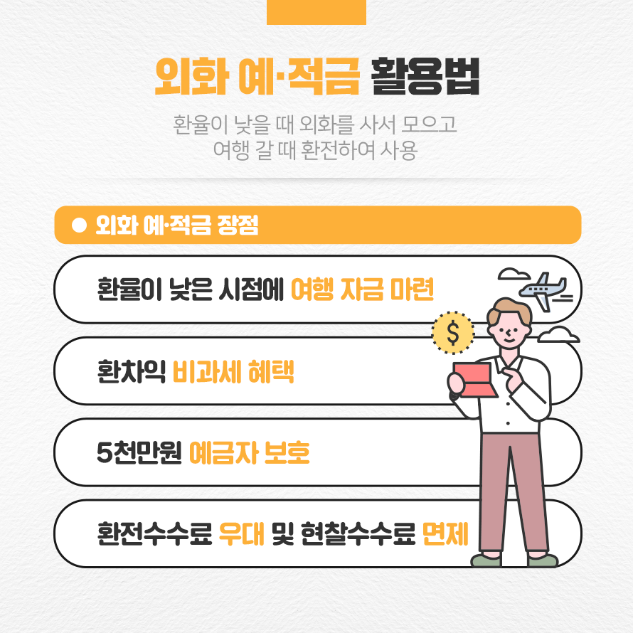 이러한 환차익에 대해서는 비과세 혜택이 적용되며 예금자보호법에 의해 최대 5천만원까지 예금 보호를 받을 수 있어, 장기적인 여행 준비를 하거나 여행 후 남은 외화를 효과적으로 관리하기에 좋습니다.