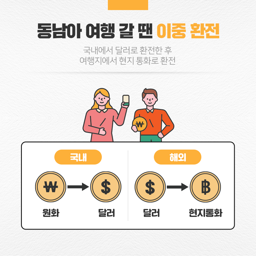 태국, 베트남, 필리핀 등 동남아시아를 방문하려는 여행객들은 한국에서 환전한 달러를 여행지에서 현지통화로 환전하는 이중 환전이 유리할 수 있습니다. 이는 동남아 화폐의 국내 유통량이 적어 주요 외화에 비해 환전수수료가 높기 때문입니다.
