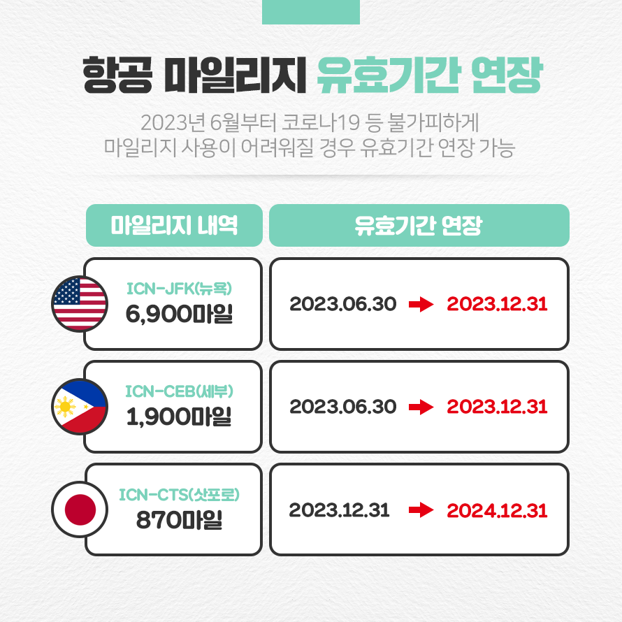 이번 조치로 2023년 6월과 연말 소멸 예정이었던 마일리지 유효기간이 연장되었으니 혹시 소멸 예정인 항공사 마일리지가 있는지 확인해 보시기 바랍니다.