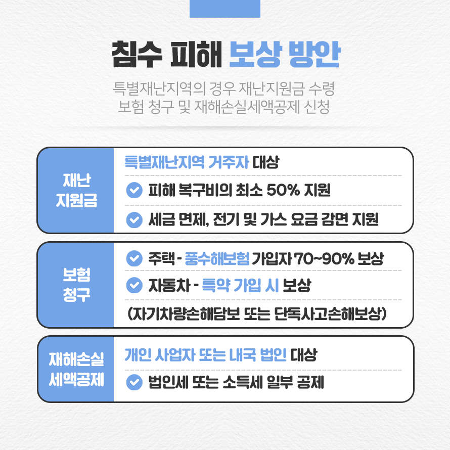 침수된 주택이 풍수해보험에 가입이 되어 있다면 보험사에 사고접수 한 뒤, 피해사진과 건축물관리대장, 주민등록등본, 수리비 견적서와 같은 손해입증서류를 함께 제출하면 보험 상품에 따라 70~90% 수준을 보상받을 수 있습니다. 이때 유의할 점은 재난지원금과 중복 보상이 안된다는 것입니다. 예를 들어 80㎡ 주택을 소유한 집주인이 90%를 보상해주는 풍수해보험에 들었고 집이 전파했을 경우 보상금은 풍수해 보험으로 7천만원, 재난지원금으로 천만원이 있습니다. 하지만 두 가지 모두를 받는 것이 아니라 보험금 7천만원에서 재난지원금 천만원을 뺀 6천만원을 받는 것입니다. 정부의 재난지원금 외에 지자체나 다른 단체의 구호비, 의연금 등은 풍수해보험과 관계없이 받을 수 있으며, 인명피해가 있을 경우엔 보험 보상과 재난지원금을 함께 받을 수 있습니다.