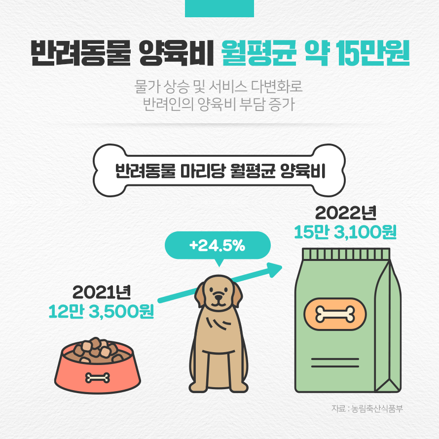 농림축산식품부의 ‘2022년 동물보호에 대한 국민의식조사’에 따르면 반려동물 1마리당 평균 양육비는 15만 3,100원이라고 나타났습니다. 이를 품종별로 따라 살펴보면, 강아지를 키우는 데는 18만 2,600원이 들며, 고양이를 키우는 데는 13만 7,600원이 드는 것으로 조사되었습니다. 이는 2021년 평균 양육비(12만 3,500원)과 비교하면 24.5% 증가한 수준입니다.