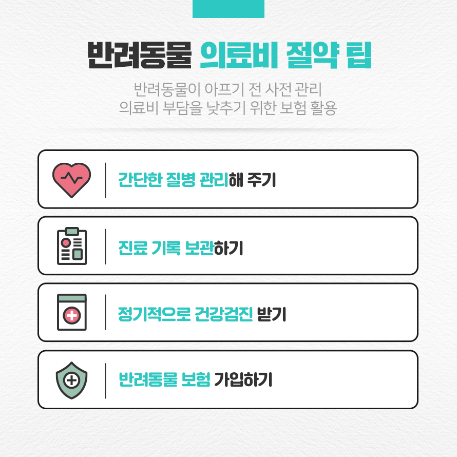 반려동물 양육비에서 가장 큰 부분을 차지하는 것은 ‘병원비’입니다. 사람과 달리 동물에게는 건강보험이 적용되지 않기 때문에 반려동물이 늙거나 아프면 의료비 부담이 높아질 수밖에 없기 때문입니다. 병원비를 미리 반려동물이 아프기 전에 미리 준비하고 관리해 주면 추후 병원 비용을 절약하는 데 큰 도움이 됩니다.
