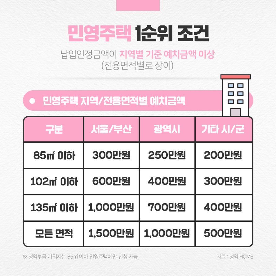 민영주택의 청약 조건은 지역별 전용면적에 따라 달라집니다. 서울과 부산은 전용면적에 따라 납입금액 300~1,500만원, 광역시는 250~1,000만원, 기타 시/군은 납입금액 200~500만원 이상이 예치되어 있어야 1순위 조건에 해당합니다.