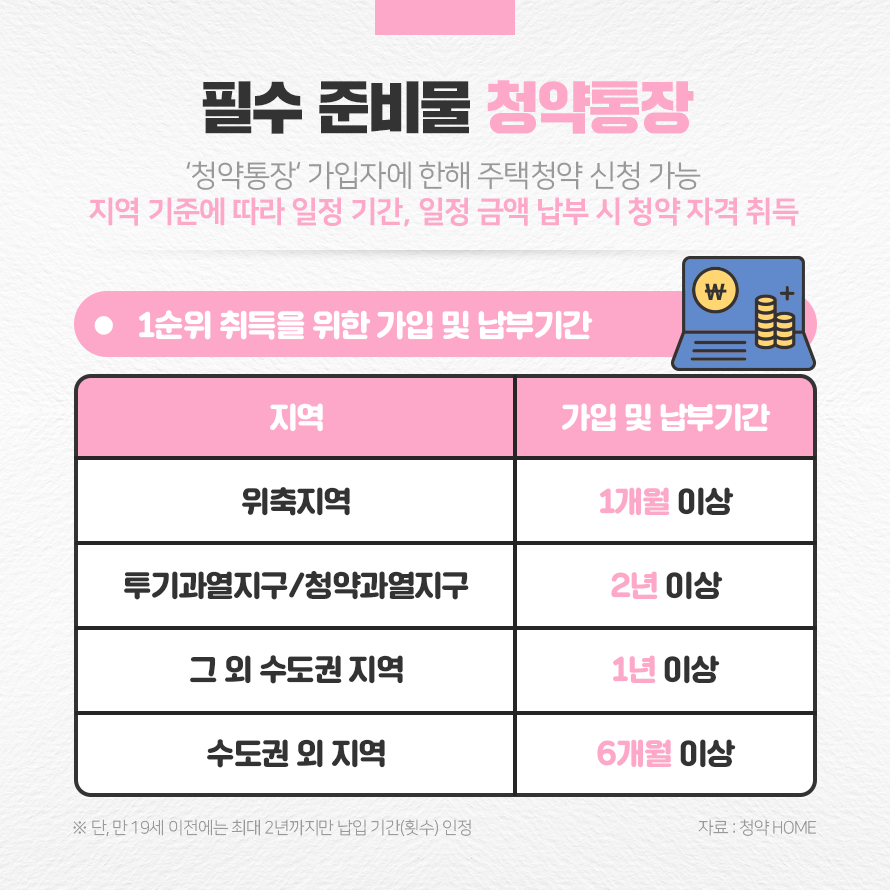 물론, 청약통장을 만들었다고 바로 청약을 신청하고 당첨될 수 있는 것은 아닙니다. 주택 청약을 신청하고 당첨 확률을 높이기 위해서는 1순위 자격을 취득해야 합니다. 1순위 자격은 가입 기간과 납입 금액(횟수)을 기준으로 하며, 지역이나 공고에 따라 기준이 조금씩 상이합니다. 따라서 청약에 신청하기 전 신청하는 주택의 지역 구분과 가입한 청약 통장의 가입 기간, 납입금액(횟수)에 대해 확인하여야 합니다. 청약제도에 대한 자세한 내용은 청약HOME 홈페이지의 청약제도안내를 통해 확인해 보시기 바랍니다.