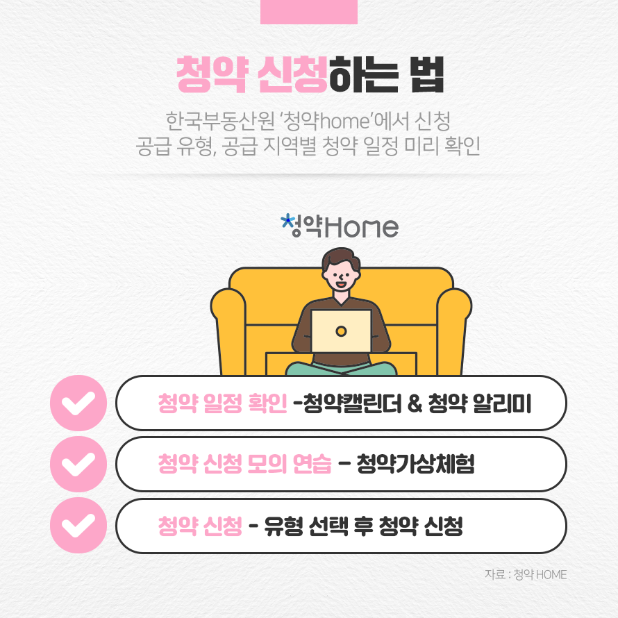 내 집 마련을 목적으로 많은 사람들이 청약 통장을 보유중이지만, 청약 신청 방법을 몰라서 제대로 활용하지 못하고 있는 경우가 많습니다. 청약 신청 방법과 자격 조건을 미리 숙지하셔서 ‘내 집 마련의 꿈’을 꼭 이루시기 바라겠습니다.