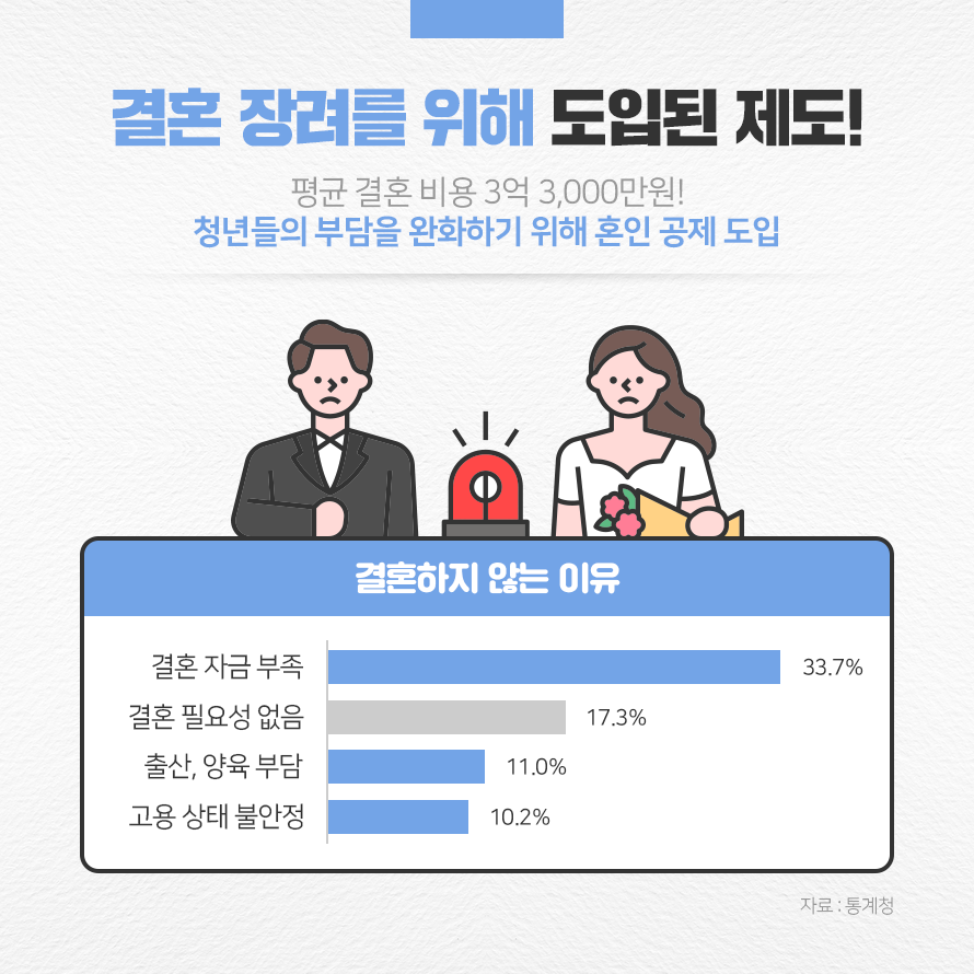 실제 통계청의 조사에 따르면 청년(만 19~34세) 10명 중 3명만이 결혼에 대해 긍정적으로 생각하고 있는 것으로 나타났습니다. 또한 결혼을 하지 않는 것은 ‘결혼자금 부족(33.7%)’, ‘출산 및 양육 부담(11.0%)’, ‘고용 상태 불안정(10.2%)’ 등으로 주로 경제적인 이유 때문이었습니다.