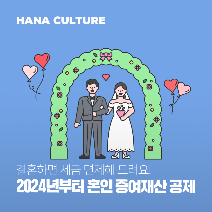 2024년 1월 1일부터 ‘혼인에 따른 증여재산 공제’가 신설됩니다. 이에 결혼할 때 직계존속(부모 또는 조부모)으로부터 최대 1억원을 무상 증여 받을 수 있게 되었습니다.