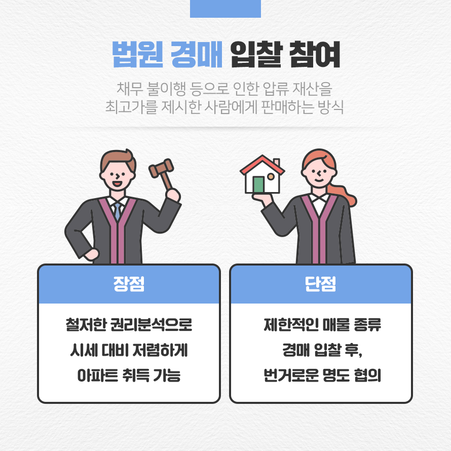 한편 빠른 시일 내 원하는 조건의 매물을 찾아야 한다면 좋은 매매 방법이 아닐 수 있습니다. 경매에 나오는 매물은 채무불이행 등으로 인한 압류 재산으로 한정되는 만큼 일반 매매보다는 매물이 다양하지 않기 때문에 원하는 매물을 찾는 것이 쉽지 않기 때문입니다. 또한 경매 입찰 후, 현재 거주 중인 집주인 또는 임차인을 내보내고 재산권을 행사할 수 있도록 명도해야 하는데, 협의가 원활하지 않을 경우 정당한 권리행사까지 오랜 시간이 소요될 수 있다는 단점도 있습니다.
