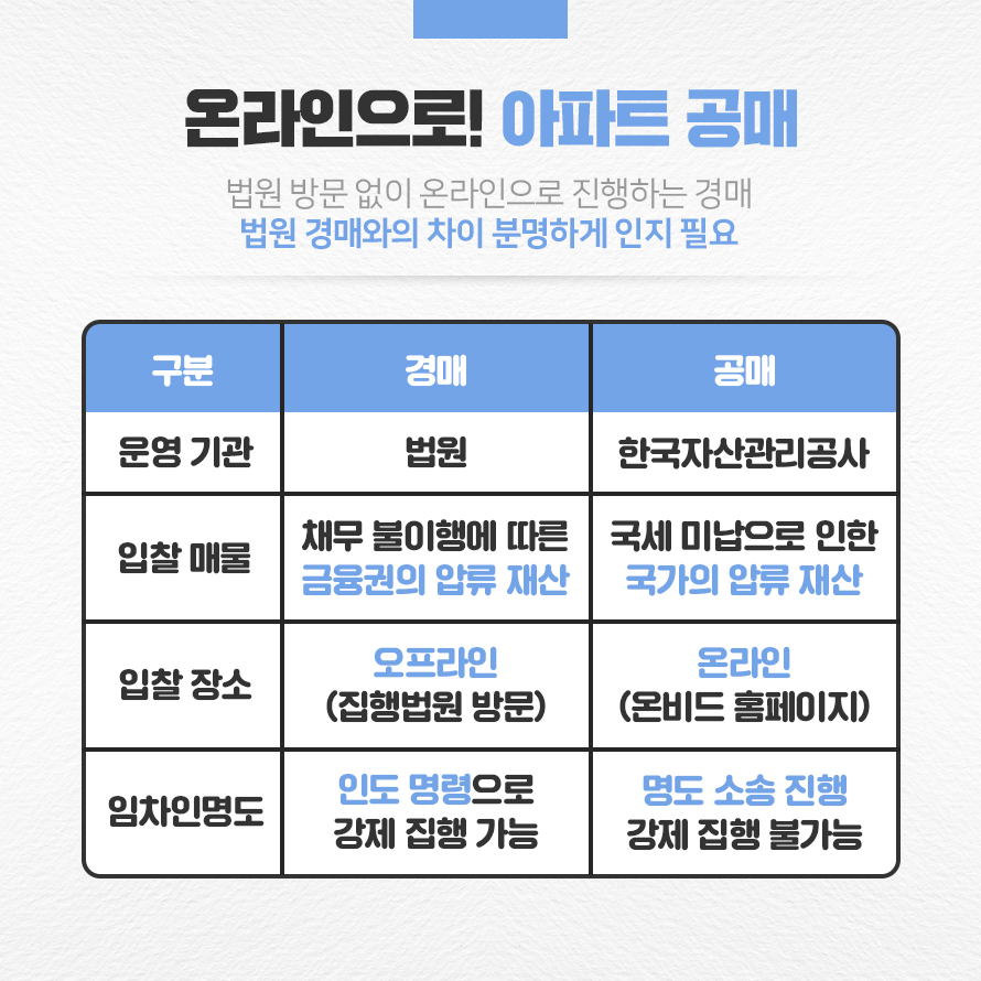 이렇게만 보면 공매가 경매보다 편리하고 쉬워 보일 수 있습니다. 하지만 명도 과정은 공매가 오히려 더 복잡합니다. 국가가 압류한 물건은 매수자에게 권리를 우선적으로 보장하지 않는 만큼, 낙찰 후 현재 거주 중인 집주인, 세입자에게 강제적으로 ‘인도 명령’을 진행하는 것이 불가능하고 반드시 ‘명도 소송’을 진행해야 하기 때문입니다. 소송 기간이 적게는 4~6개월, 길게는 1년까지도 걸릴 수 있는 만큼 공매에 참여할 때는 이러한 시간과 비용을 모두 고려하고 참여해야 합니다. 또한 경매보다 공개된 정보다 적은 만큼 더욱더 철저한 권리분석을 해야 합니다.