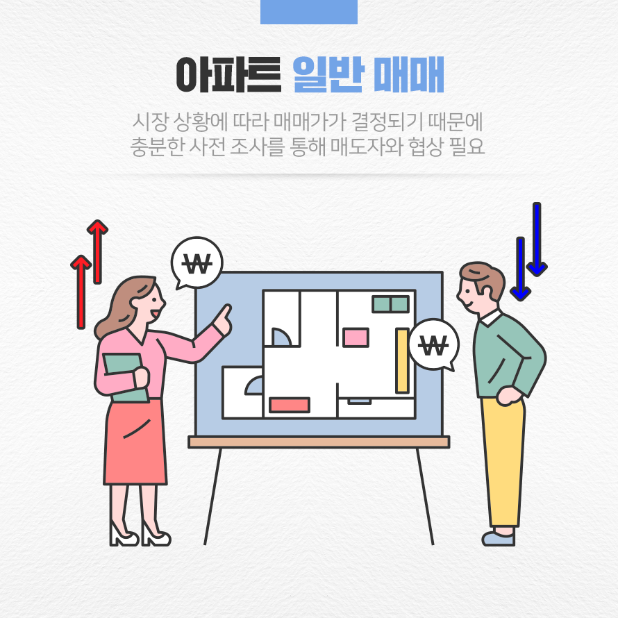 만일 아파트를 팔고자 하는 매도자와 협상이 잘 이루어졌다면, 시세보다 싼 급매물을 거래할 수도 있고 부동산 투자를 통해 충분한 수익을 낼 수도 있습니다. 하지만 반대로 주변 매물들의 가격을 미리 확인하지 못하고 거래했을 경우 시세보다 비싸게 아파트를 매입하는 경우도 생길 수 있습니다. 따라서 일반 매매를 할 때는 충분한 손품, 발품을 팔아 충분한 조사가 선행되어야 합니다.