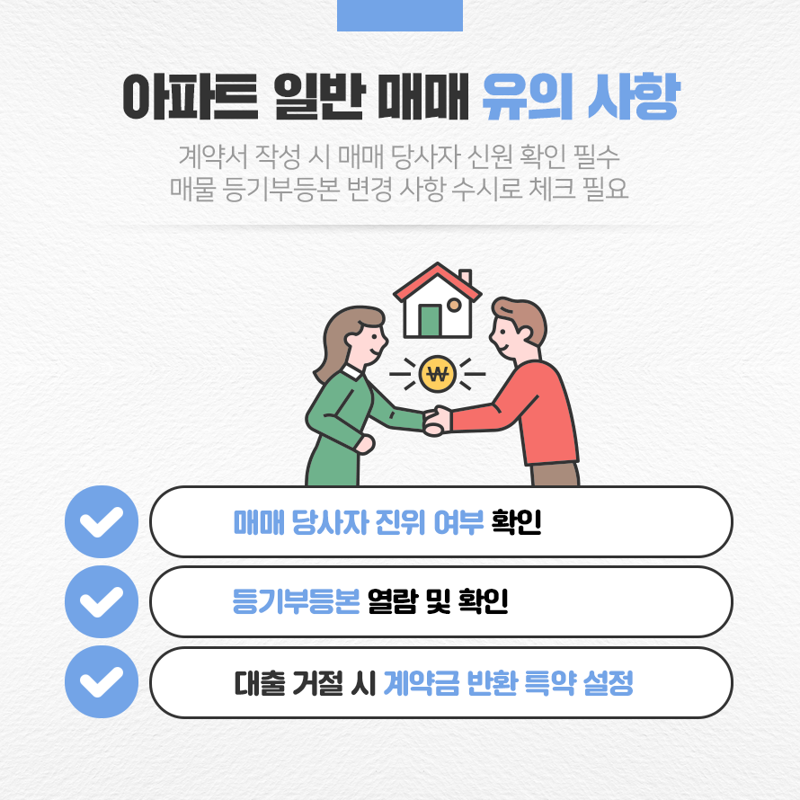 만일 아파트를 팔고자 하는 매도자와 협상이 잘 이루어졌다면, 시세보다 싼 급매물을 거래할 수도 있고 부동산 투자를 통해 충분한 수익을 낼 수도 있습니다. 하지만 반대로 주변 매물들의 가격을 미리 확인하지 못하고 거래했을 경우 시세보다 비싸게 아파트를 매입하는 경우도 생길 수 있습니다. 따라서 일반 매매를 할 때는 충분한 손품, 발품을 팔아 충분한 조사가 선행되어야 합니다.