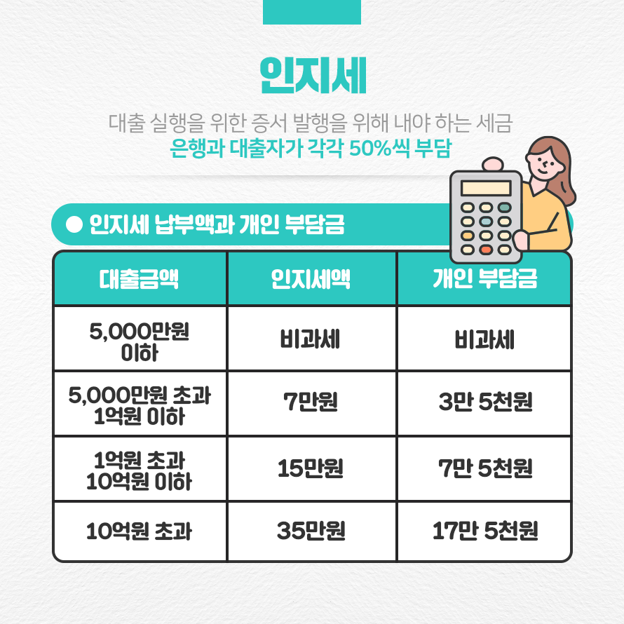 대출을 받게 되면 재산상의 권리의 변동 및 승인을 표시하는 증서를 발행하게 되는데, 해당 서류를 발행할 때 ‘인지세’라는 세금이 부과됩니다. 인지세는 대출거래약정에 따라 은행과 대출자가 각각 50%씩 납부하게 됩니다. 다만 대출 실행 시 부과된 금액만큼 자동으로 제외하고 실행되며 금융기관에서 세무서로 납부를 해주기 때문에 대출자가 따로 납부할 필요는 없습니다.