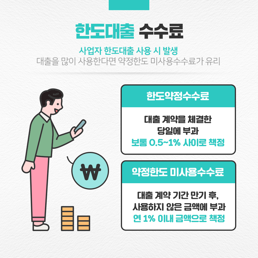 마이너스통장이라고 불리는 한도대출을 사용할 때도 수수료가 발생합니다. 고객이 한도대출을 개설만 하고 돈을 쓰지 않는 경우에 대비해 미리 받는 수수료입니다. 개인에 대한 한도대출수수료는 폐지됐지만 법인 또는 개인 사업자에 대한 한도대출수수료는 유지되고 있으니 자신이 받은 한도대출이 수수료가 부과되는지 확인이 필요합니다.