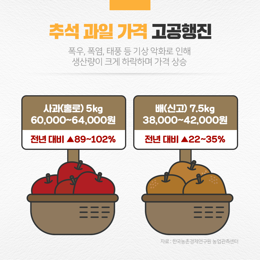 생산량이 상당히 줄어든 상황에서 추석을 앞두고 수요가 급격히 증가하며 과일 가격이 크게 오른 상황입니다. 실제 한국농촌경제연구원 농업관측센터는 추석 성수기(2023.9.15~2023.9.28) 사과 출하량은 전년 대비 12% 감소하며 홍로 5kg 기준 가격이 60,000원~64,000원(▲89~102%), 배의 출하량은 전년 대비 8% 감소하며 신고 7.5kg 기준 가격이 38,000원~42,000원(▲22~35%)으로 전년 대비 높은 가격에 거래될 것으로 전망한 바 있습니다.