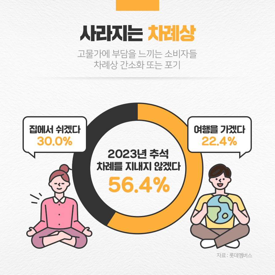 한 멤버십 업체에서 20~50대 이상 소비자 4,000명을 대상으로 설문 조사를 진행한 결과, 응답자 절반 이상(56.4%)이 추석 차례를 지내지 않겠다고 응답했습니다. 또한 2023년 10월 2일 월요일이 임시공휴일로 정해지면서 연휴가 길어졌음에도 불구하고 추석에 고향, 부모님 또는 친척 집을 방문하기보다 집에서 쉬거나 (30.0%) 여행을 갈 계획(22.4%)이라는 답변도 많았습니다.