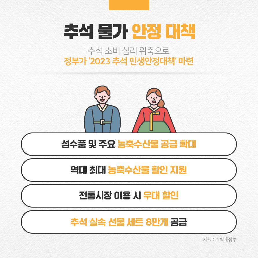 물가가 오르는 상황에서, 고금리 현상도 장기화되며 소비 심리가 위축되자 정부는 추석 물가, 민생 안정 및 내수 활성화를 위해 '2023 추석 민생안정대책’을 마련했습니다. 각종 할인 혜택들이 마련되어 있으니 추석 상차림 준비를 계획 중이라면 이를 잘 활용해 보시기 바랍니다.