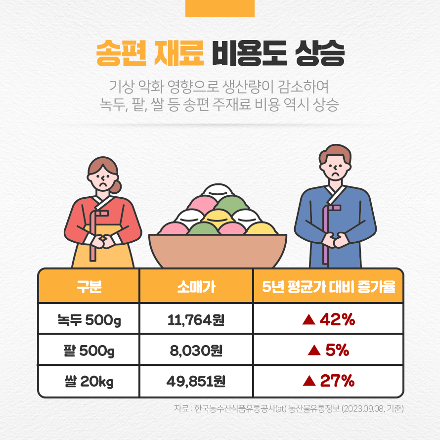 추석 하면 떠오르는 대표 음식 ‘송편’을 만드는 재료 비용도 모두 줄줄이 올랐습니다. 한국농수산식품유통공사(aT) 농산물유통정보에 따르면, 송편 안에 들어가는 ‘소’에 쓰이는 주재료들의 가격이 모두 올랐습니다. 녹두는 500g 기준 11,764원으로 5년 평균 가격 대비 42% 높고, 팥은 500g 기준 8,030원으로 약 5% 상승한 상황입니다. 뿐만 아니라 송편 반죽의 주재료인 쌀도 20kg 기준 49,851원으로 전년 대비 약 27% 상승한 상황입니다. 송편 주재료 가격이 감소한 이유는 과일과 마찬가지로 기상 악화의 영향으로 생산량이 크게 감소한 탓입니다.