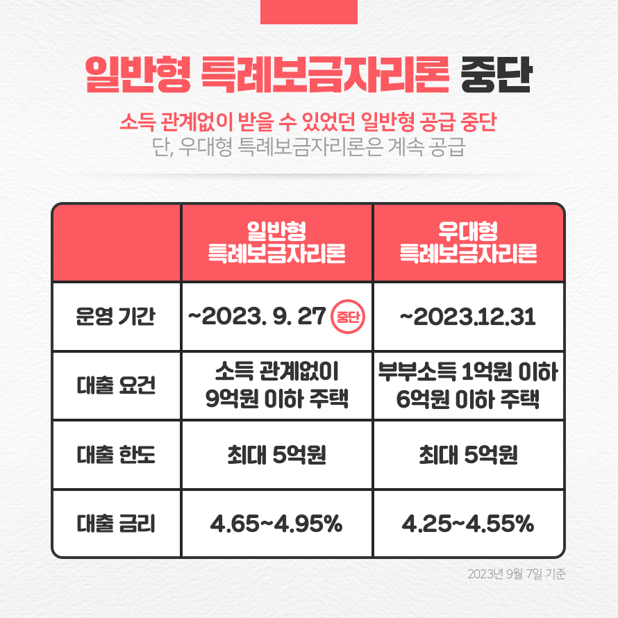 예외적으로 ‘우대형 특례보금자리론’은 계속 유지됩니다. 부부소득이 1억원 이하이고 주택가격이 6억원 이하라면 연 4.25~4.55% 금리로 대출을 받을 수 있습니다. (2023년 9월 7일 기준) 한국주택금융공사에 따르면, 특례보금자리론이 출시 7개월 만에 전체 공급 목표의 90%를 이미 채운 만큼 앞으로는 도움이 필요한 실수요층을 위한 지원에 집중하겠다는 방침입니다.