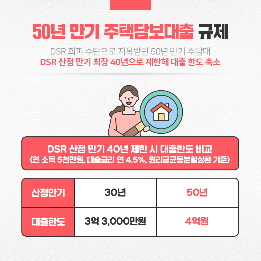 금융당국에서는 소득에 비해 과도한 대출을 방지하도록 1년간 갚을 원리금이 연 소득의 40%가 넘지 않도록 규제하고 있는데, 만기를 늘리면 DSR 규제와 관계없이 빌릴 수 있는 대출한도를 늘릴 수 있기 때문입니다. 예를 들어, 연봉 5,000만원의 차주가 4.5%금리로 주담대를 받을 경우 30년 만기일 때는 3억 3,000만원을 대출받을 수 있는 반면, 50년 만기일 때는 4억원까지 대출받을 수 있게 됩니다.