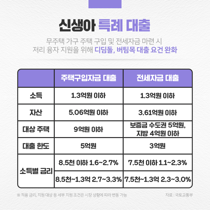 신생아를 출산한 무주택 가구가 주택 구입 시 저리로 융자를 지원받을 수 있도록 디딤돌 대출 요건도 대폭 완화합니다. 소득 요건은 모두 연 7천만원에서 1억 3천만원으로 기존 대비 2배 수준으로 완화됩니다. 또한, 주택 가액 기준은 기존 6억원에서 9억원 이하로, 대출 한도는 4억원에서 5억원으로 상향하고, 대출 금리는 5년간 시중 금리 대비 약 1~3% 낮출 예정입니다.