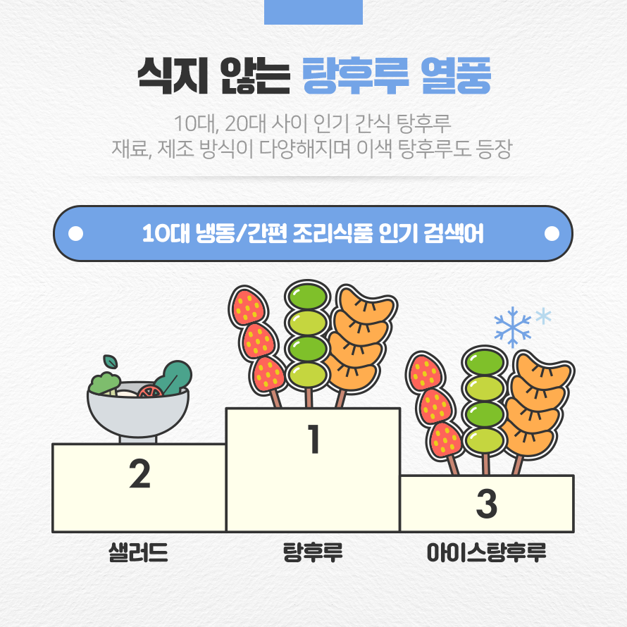 탕후루 열풍이 불고 있습니다. 현재 10대 사이에서 가장 인기 있는 길거리 음식은 ‘탕후루’라고 해도 과언이 아닙니다. 학생들 사이에서 ‘마라탕후루(마라탕으로 식사한 뒤 간식으로 탕후루 먹기)’라는 말이 유행어가 되었을 정도입니다. 오늘은 반짝거리고 알록달록한 모습으로 젊은 층의 사랑을 받고 있는 ‘탕후루 열풍’에 대해 알아보도록 하겠습니다.