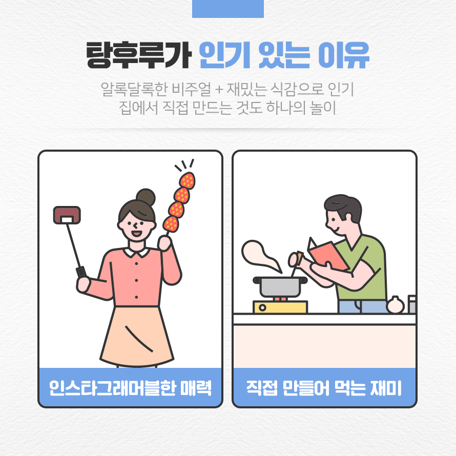 탕후루는 과일꼬치에 설탕을 끓여 만든 시럽을 묻힌 뒤 굳혀 만든 중국의 길거리 간식입니다. ASMR 먹방 영상이 인기를 끌며 탕후루에 대한 인지도가 높아지더니 지금은 이색 탕후루까지 등장하며 대중화되었습니다.
