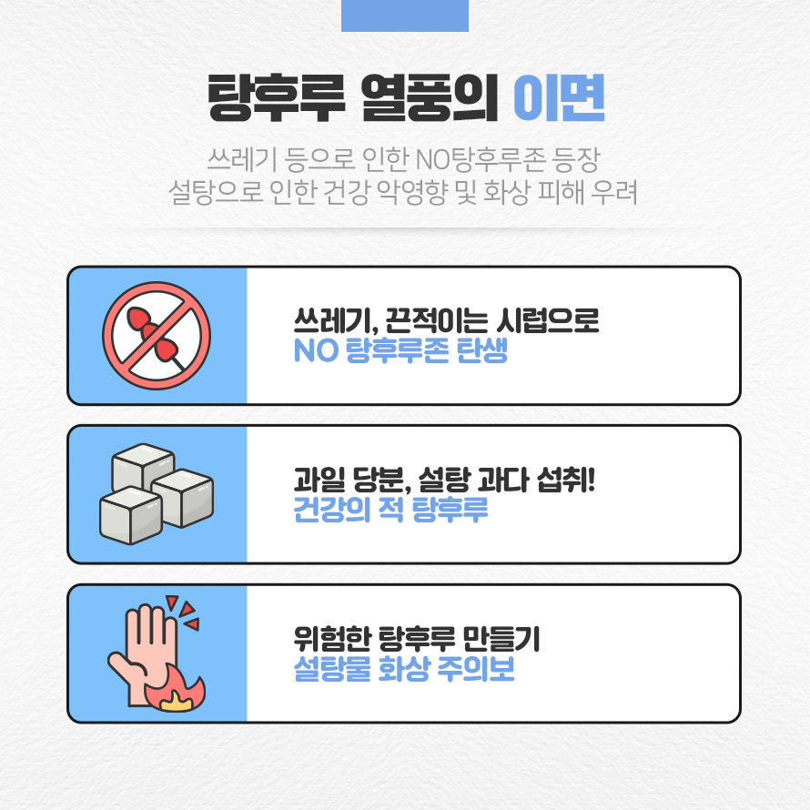 탕후루가 인기를 끌면서 골칫덩이로 떠오르는 문제가 있습니다. 바로 탕후루를 먹고 남은 꼬치와 종이컵 쓰레기입니다. 길거리 음식이다 보니 돌아다니며 먹는 사람들이 많고 먹고 남은 쓰레기를 올바른 곳에 버리지 않는 상황들이 많이 생기는 것입니다. 뾰족한 꼬치를 아무 곳에나 꽂아 위험한 상황이 연출되기도 하고, 길바닥에 그냥 버려져 있어 행인들의 눈살을 찌푸리게 합니다. 탕후루의 설탕 시럽이 녹아떨어진 곳엔 벌레가 꼬이고 찐득해져 탕후루 매장 주변의 가게들은 ‘NO 탕후루존’이라는 문구를 부착하여 탕후루를 들고 매장으로 들어오지 못하게 하는 경우도 많아지고 있습니다.