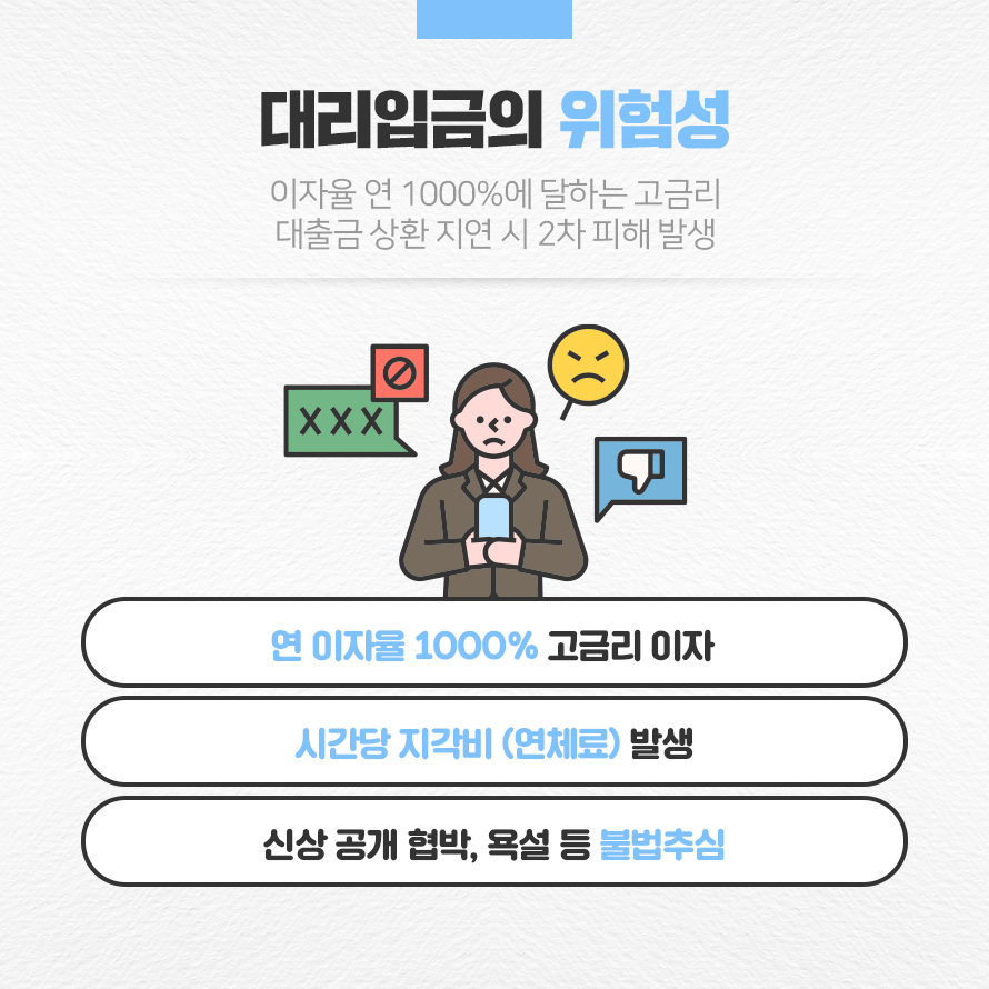 대리입금은 연 단위로 이자율을 환산하면 1000%가 넘는 고금리 대출입니다. 실제 SNS 대리입금 광고를 통해 580여명의 청소년에게 1억 7,000만원을 빌려주고 연 5475%의 이자를 받은 사례가 있었습니다.