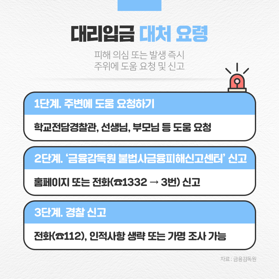 청소년 대리입금은 그저 남의 이야기가 아닙니다. 나 또는 주변에서 일어날 수 있는 일인 만큼 스스로 경각심을 가지고, 주의를 기울이는 것이 필요합니다. 그리고 피해 의심 또는 발생 시 망설이지 말고 주변에 적극적으로 도움을 요청하시기 바랍니다.