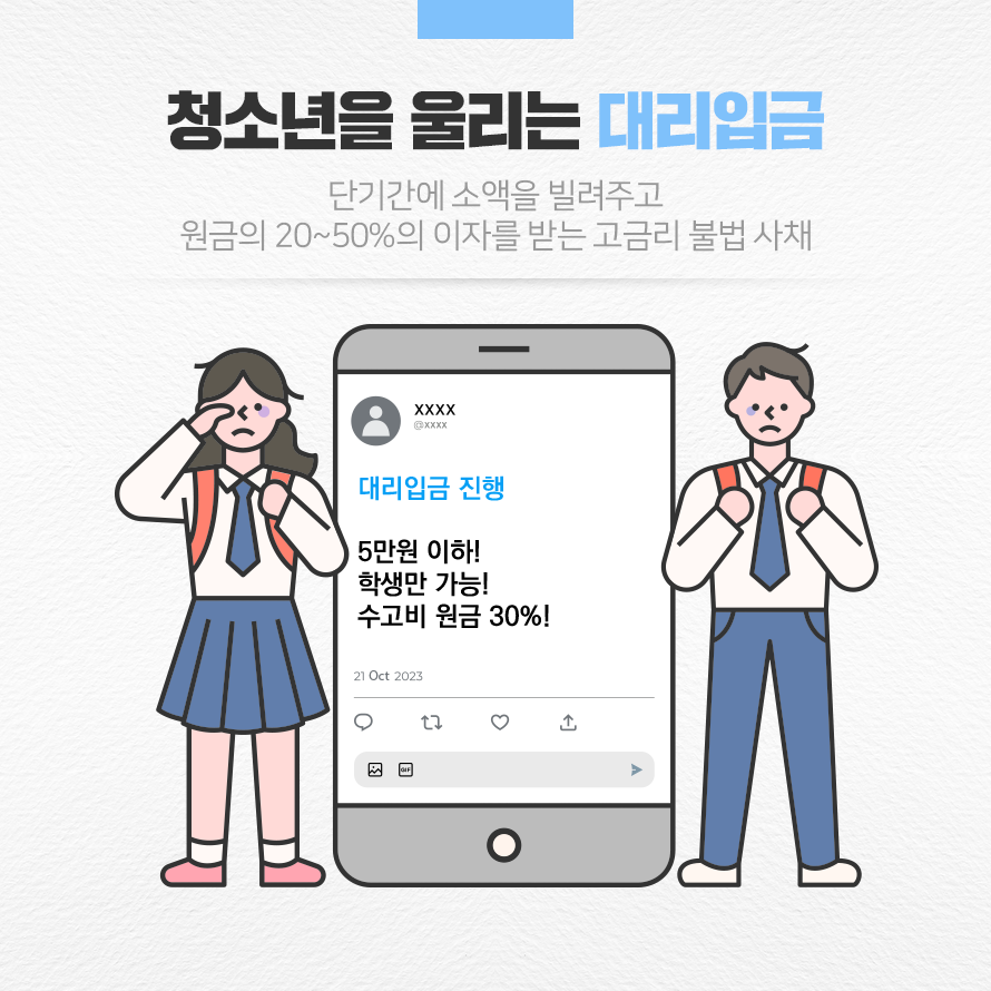 SNS를 통해 급전이 필요한 청소년에게 소액의 돈을 빌려주겠다는 ‘대리입금’ 광고가 유행하고 있습니다. 광고에 현혹되어 대리입금을 받을 경우, 높은 이자를 수고비로 지불하거나 협박, 개인정보 유출 등 2차 피해로 이어질 수 있는 만큼 각별한 유의가 필요합니다. 오늘은 ‘대리입금의 위험성 및 대응 요령’에 대해 알아보겠습니다.