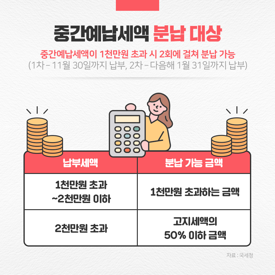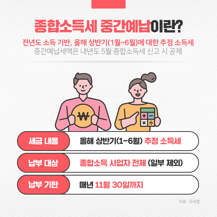 ‘종합소득세 중간예납’은 전년도 소득을 바탕으로 올해 상반기 소득을 추정해 종합소득세를 11월에 미리 납부하도록 하는 제도입니다. 중간 예납한 세액은 내년도 5월 종합소득세 신고 시 기납부세액으로 공제받게 되어 납세자들은 세금을 한 번에 내야 하는 부담을 낮출 수 있고, 과세당국은 세금을 미리 확보해서 균형 있는 재정 수입을 마련할 수 있습니다.